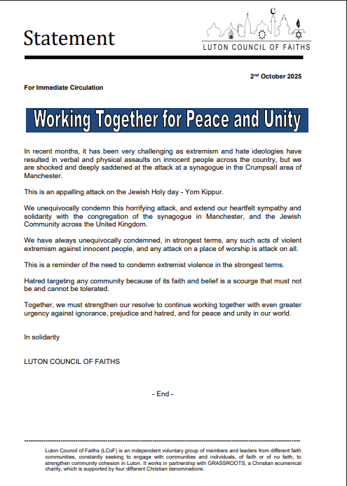 The LCoF statement said, “Leaders from all traditions in Luton, stand firmly together and will continue to safeguard our places of worship, strengthen unity, and ensure that Luton remains a town where all faiths and communities can live in peace, dignity, and mutual respect.