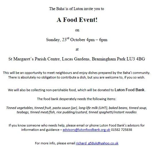 The Baha’is of Luton invite you to a "Food Event" on Sunday, 23rd October 4pm – 6pm at St Margaret’s Parish Centre, Lucas Gardens, Bramingham Park, Luton