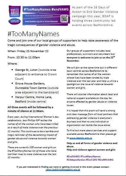 Will you join us. We are hosting a Too Many Names event and it would be great if some of you were able to join us on 25th November 2022 at 10:30am at the far end of George St (adjacent to Crown Court/Barclays) to read out the names of all those woman who have died as a result of male violence over the last 12 months.