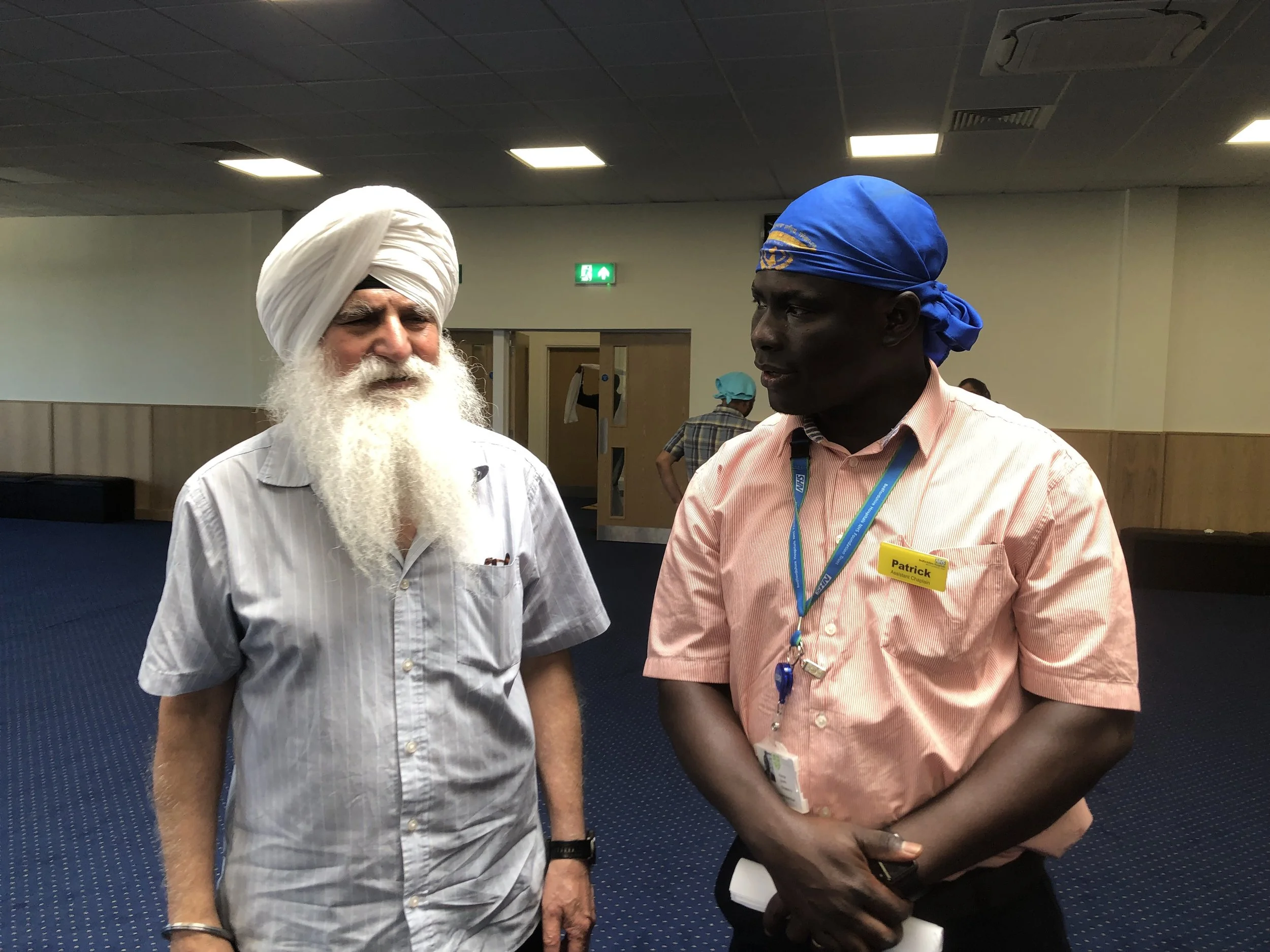 One of Bedfordshire Hospitals Chaplain Patrick in conversation with a Sikh friend Mr Avtar Singh at Guru Nanak Gurudwara (Sikh Temple)