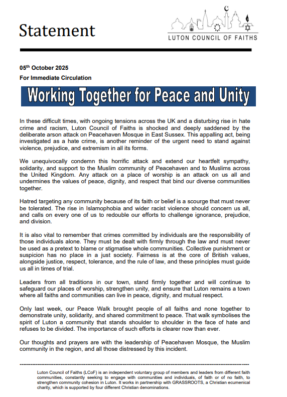 On behalf of Churches Together in Luton, Peter Adams said in a statement, “As Christian leaders in Luton we join with our colleagues and friends of all faiths in Luton in condemning the attack this weekend on the mosque in Peacehaven, Sussex. We endorse totally the statement by Luton Council of Faiths. Importantly we join with our colleagues at this time in committing ourselves to stand against all violence, prejudice and extremism however it is expressed. We cannot allow the conflict of recent days to escalate further.” https://lutonchurchestogether.org.uk/lcof-ctl-response-to-attack-on-peacehaven-mosque-on-saturday-4th-october-2025/