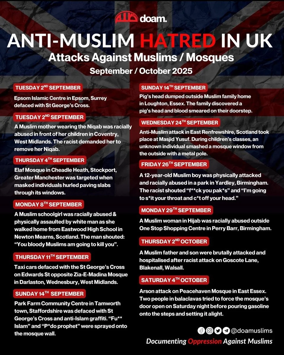 ————————————————————————————————————————————————————On behalf of Luton Council of Mosques Sujel Miah said, “There are deep concern about the escalating wave of Islamophobia and anti-Muslim hatred sweeping across the country. Over the last six weeks alone, British Muslims, their places of worship, and even burial grounds have faced multiple attacks including a Mosque set on fire over the weekend in Peacehaven: https://www.bbc.com/news/articles/cm2dglp43xmo.amp This is not a series of isolated incidents, it is a clear and escalating pattern of hate and terror directed towards British Muslims. The constant demonising, maligning, and stereotyping of Muslims by mainstream politicians, sections of the media, the far right and unchecked hate online has poisoned public discourse and emboldened far right extremists and racists.”
